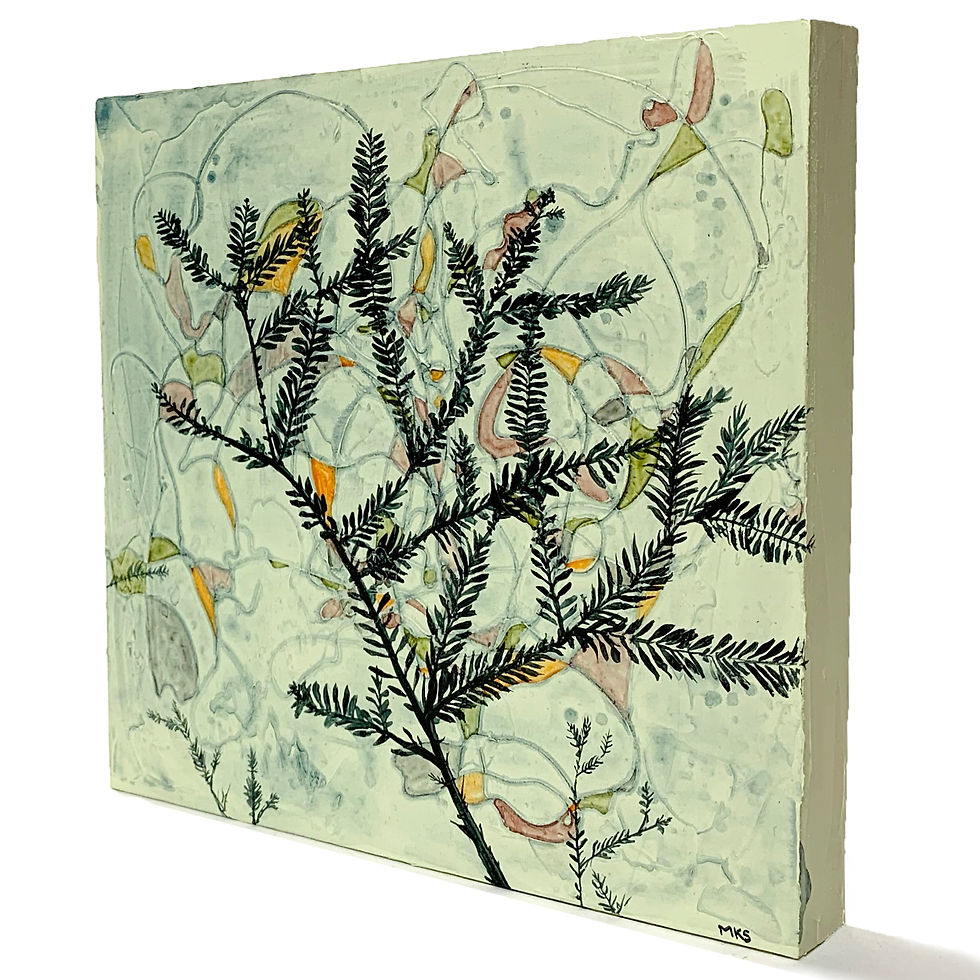 "When I paint, the most exciting part for me is being able to make natural landscapes or plant matter feel as magical and intense to others as I perceive them to be. A large part of my art making process is seeking out natural areas throughout the changing seasons to gather inspiration. I like to incorporate a variety of materials in my acrylic paintings, such as collage, sewing thread, crochet, and other mixed media. For example, I use sewing thread to create an element of texture and “chaos” in my paintings that imitates the structure of plant roots. My works draw heavily on my own experiences in nature, and I have a strong focus on portraying the feeling of being immersed in various natural spaces. The paintings I create are an exploration of the magical moments that can often be found in seemingly mundane places."